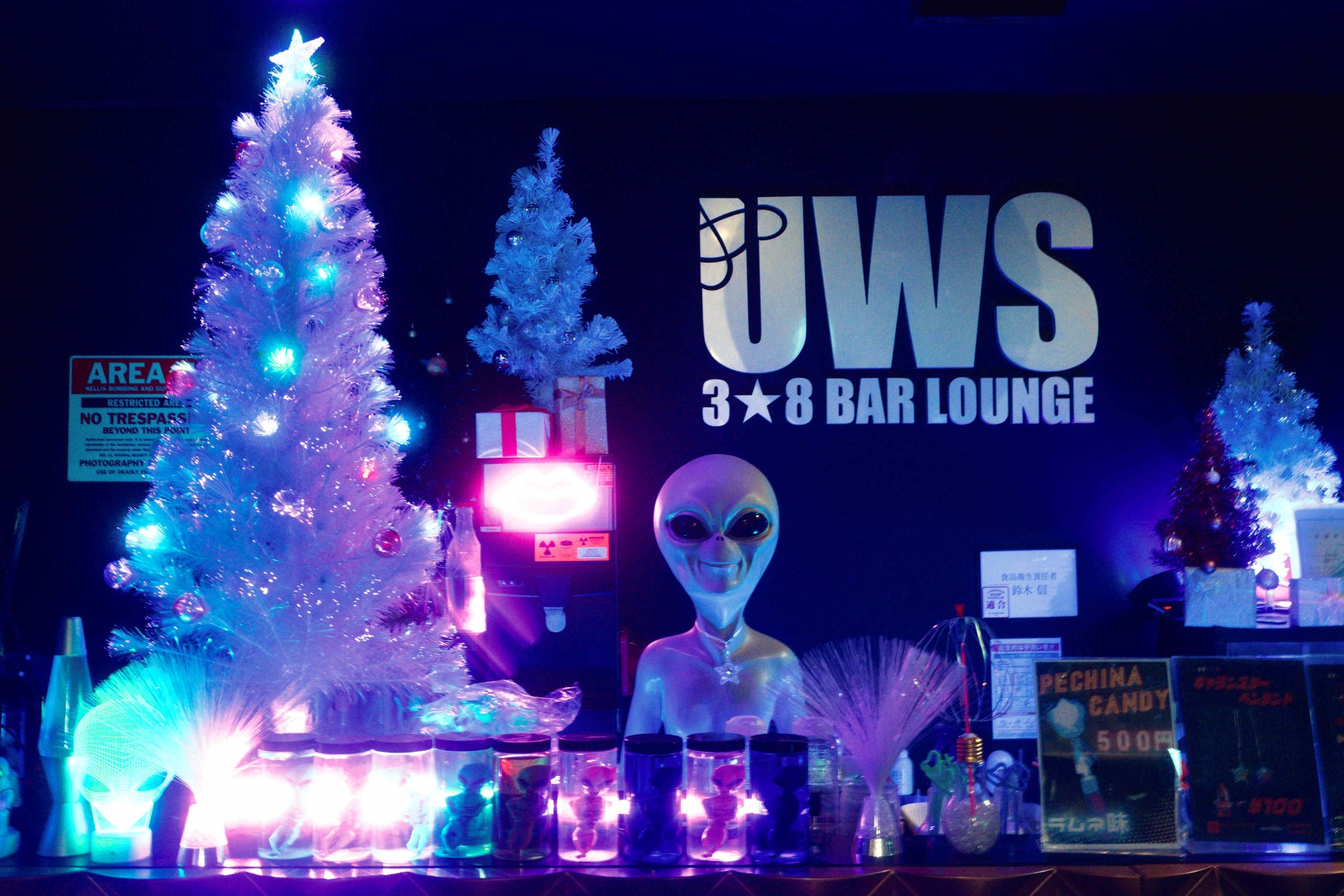 サンタクロースの白いひげを貯えた宇宙人グレイと、トナカイの角を生やした宇宙飛行士に加えて、ツリーやプレゼントをあしらいゴージャスでユニークな空間に。