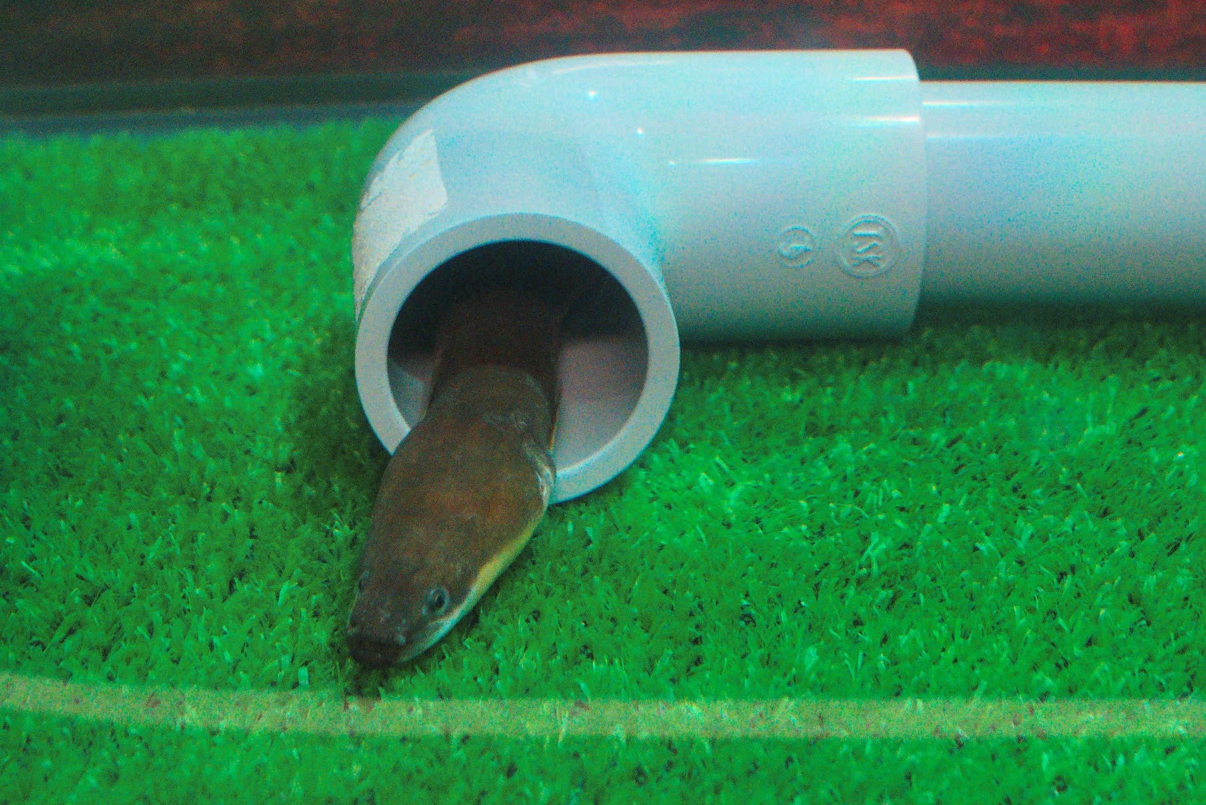 【生体解説】日本や東アジアなどの川の中流から河口域に広く生息していて、成魚は最大手間1.2m程まで成長します。昼間は砂の中や岩影に身を潜め夜になると餌を求めて活動します。エラの他にも皮膚でも呼吸ができるため、体が濡れていれば陸地の絶壁でも体をくねらせのぼることができ「うなぎのぼり」という言葉の語源になったと言われています。