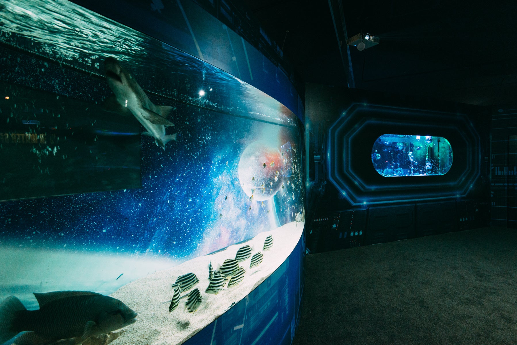 日本初となる宇宙 × アクアリウムをコンセプトにした期間限定水族館、アクアリウム宇宙旅行「UNDER WATER SPACE」は、既存の商業施設に建設が可能な新しいスタイルの水族館で、映像システムや音響、光、プロジェクションマッピングなどの最新のテクノロジーを取り入れ、空間を楽しむ8つの演出(光・影・水・音・香・動・生・驚)を提供する約220坪のエンターテイメントです。アクアリウムを水の惑星と称し、100万年に一度開催される水の惑星パーリーナイトへの参加を目的に、オリジナルのペチーナドリンクや宇宙人になれるカチューシャを付けて宇宙旅行へご案内させていただきます。